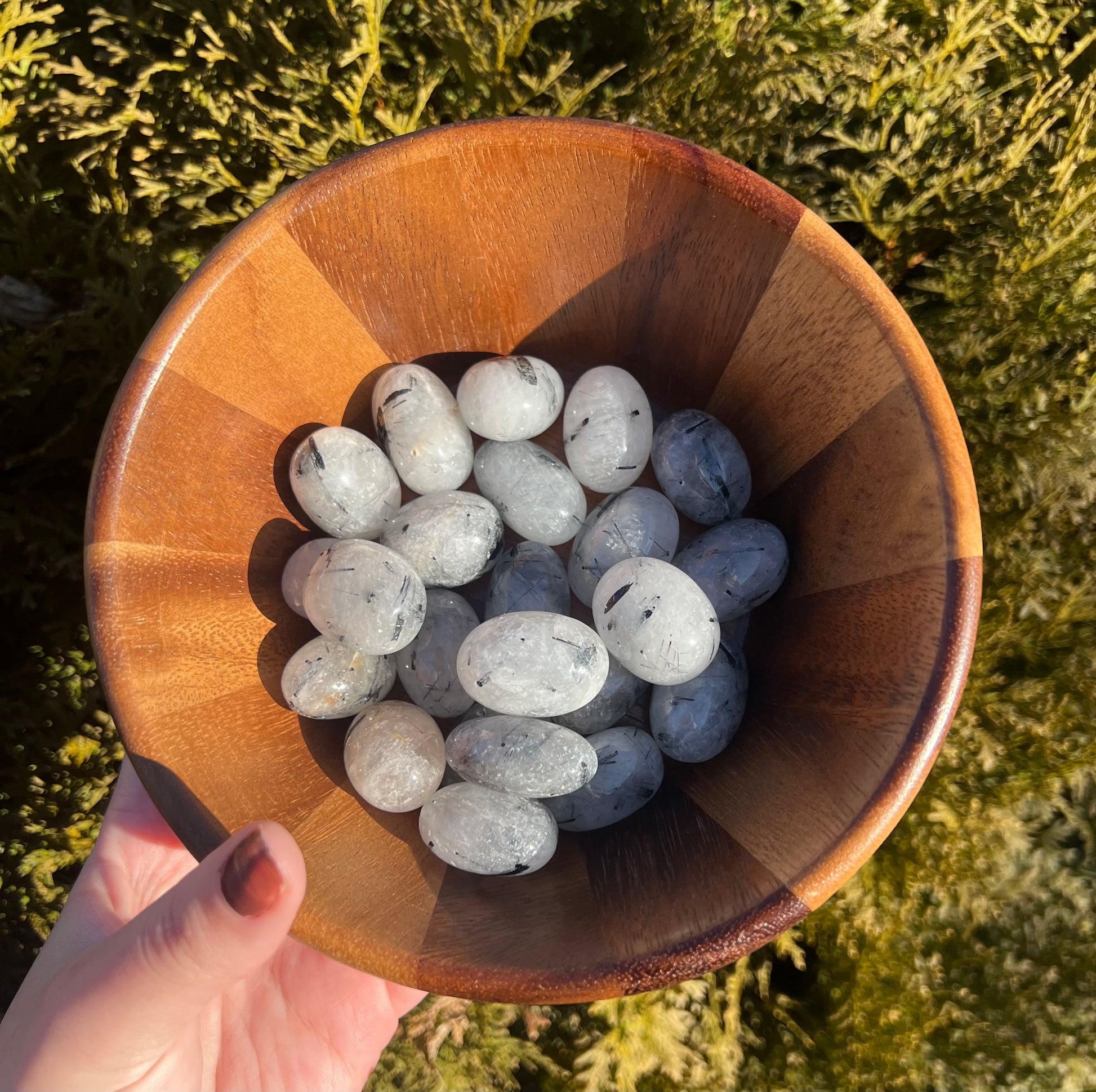 Black Rutilated Quartz tumbled stones are beautifully polished pieces of clear to smoky quartz naturally threaded with fine black rutile inclusions. These striking needle-like patterns create bold contrast and make each stone completely unique, with no two pieces ever looking the same.
