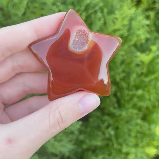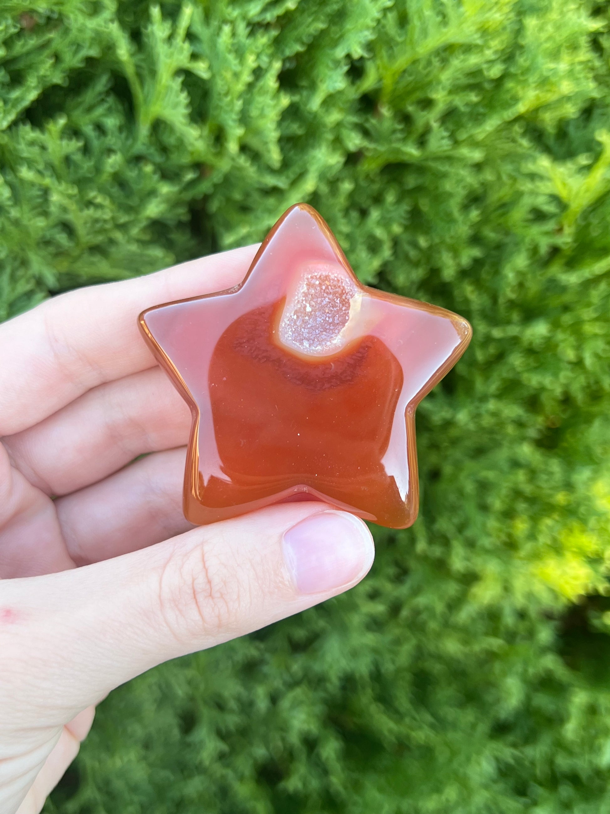 This stunning carnelian druzy star shines with warm, fiery energy and a sparkling crystal center. Carnelian is known for boosting motivation, confidence, and creativity—making this piece perfect for anyone who wants to feel energized and inspired.