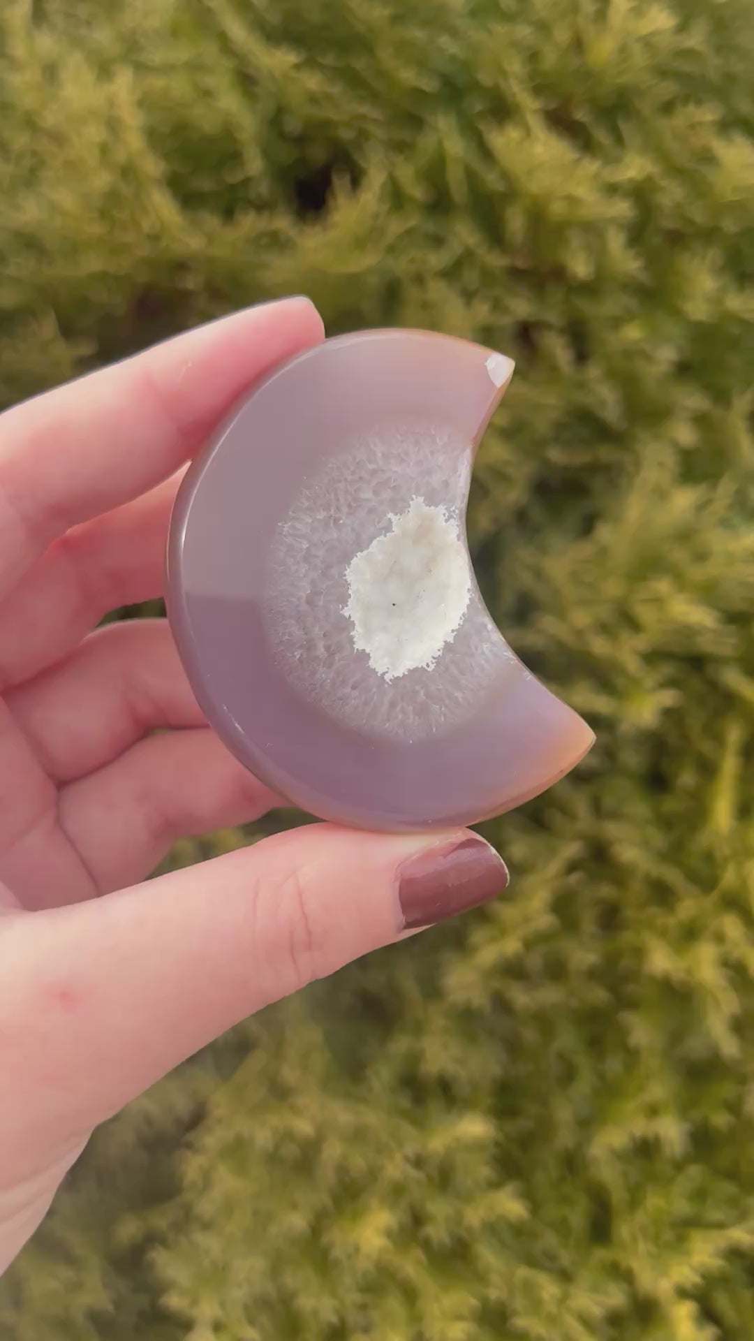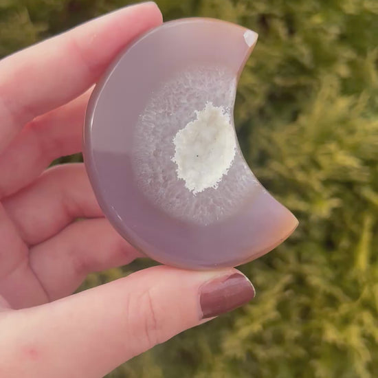 A Druzy Agate Moon combines the grounding beauty of agate with sparkling druzy crystals and a dreamy moon shape. Featuring natural banding and shimmering crystal pockets, each piece is completely unique and full of depth and texture. Agate is known for its calming and stabilizing energy, while the moon shape symbolizes intuition, balance, and new beginnings. Perfect for display, intention setting, or adding a magical touch to your crystal collection, this druzy agate moon is both soothing and eye-catching.