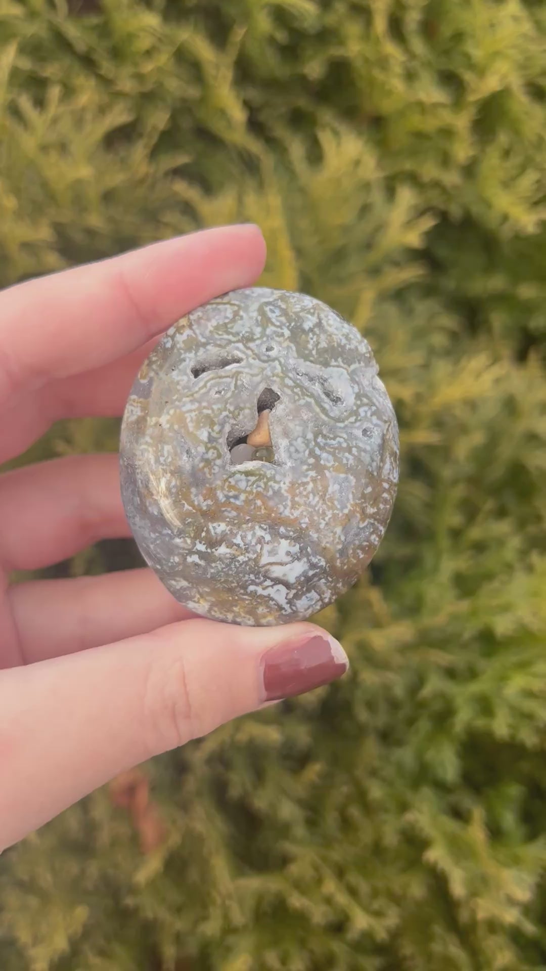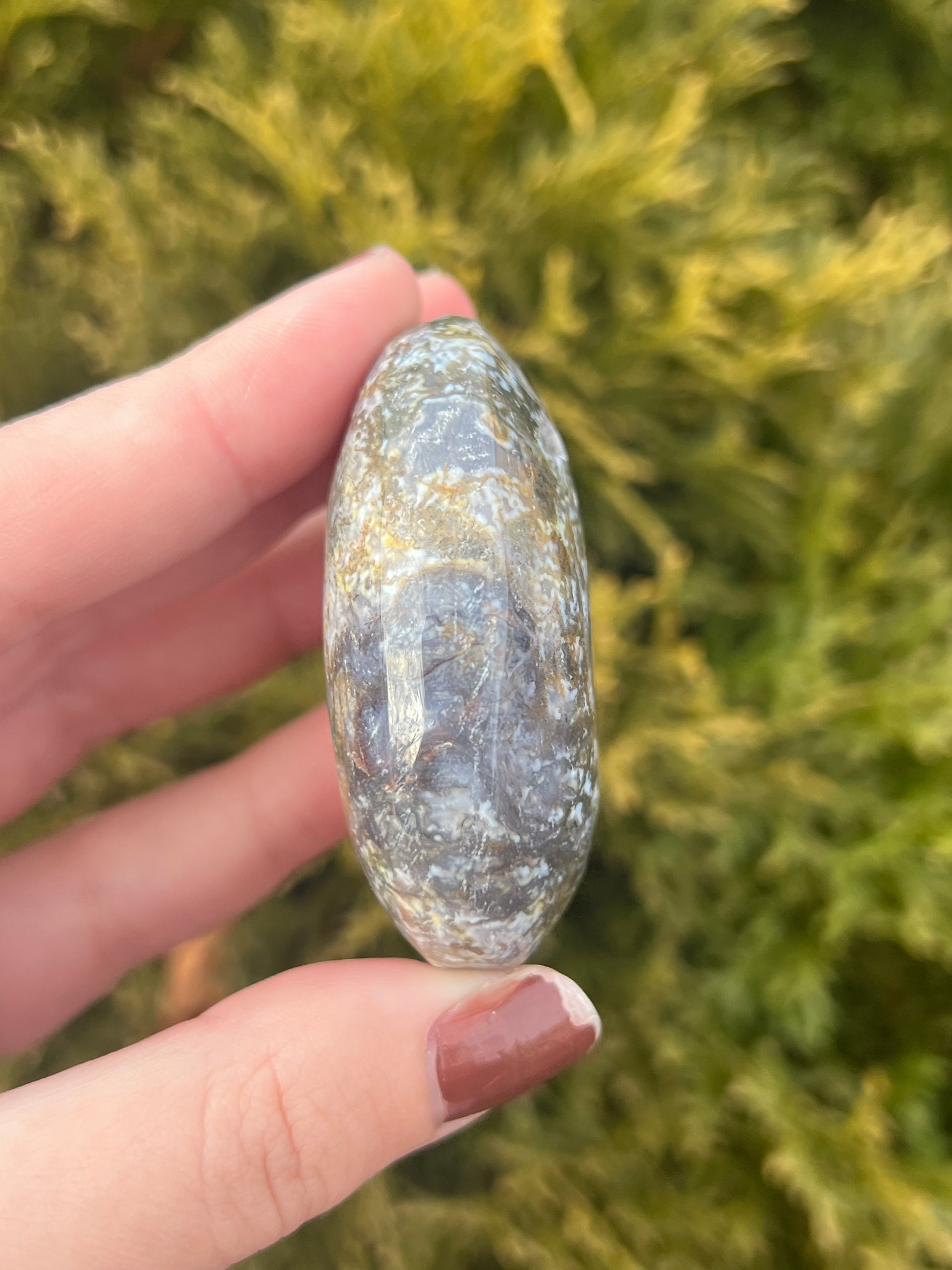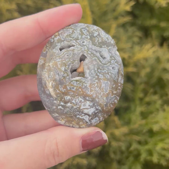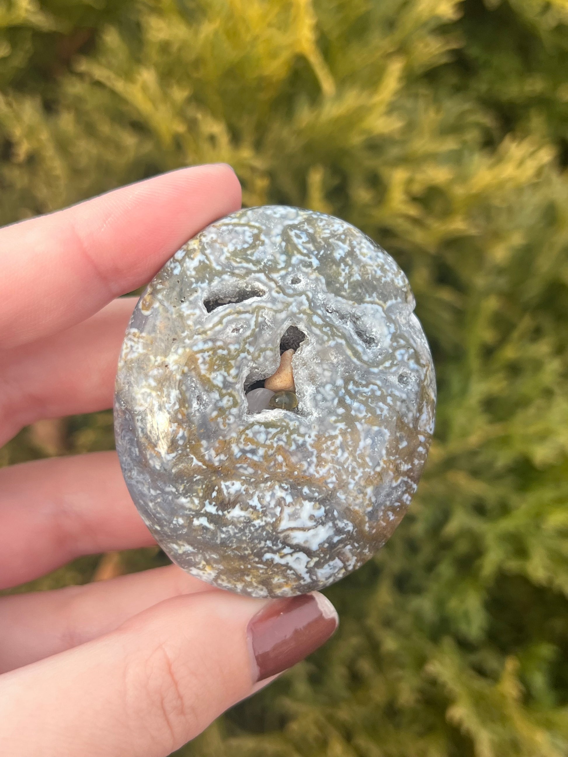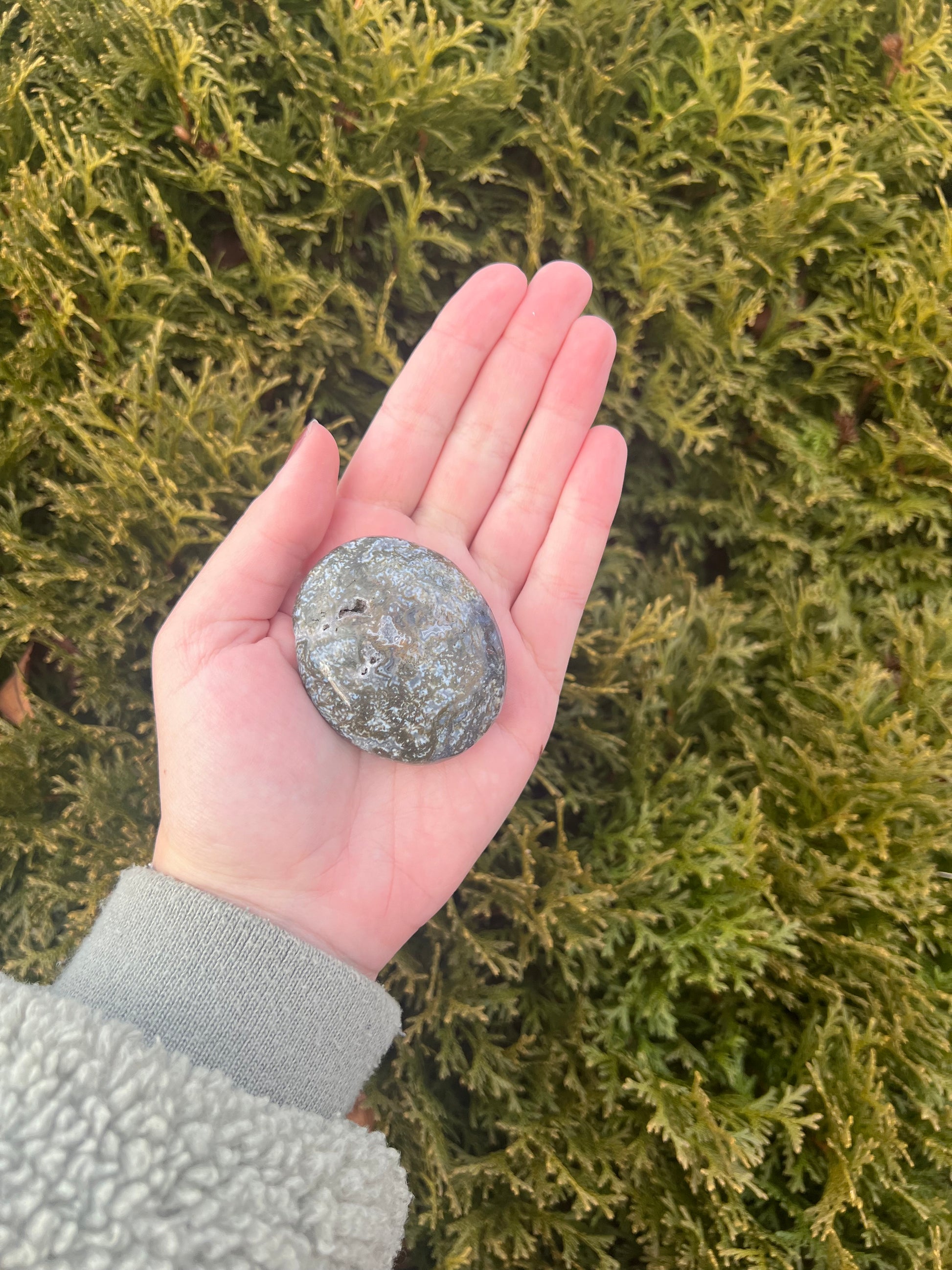 This druzy moss agate palm stone is a soothing blend of earthy greens and soft, milky tones, highlighted by pockets of sparkling druzy that catch the light beautifully. Shaped to fit comfortably in your hand, it’s perfect for moments of grounding, reflection, or gentle mindfulness.