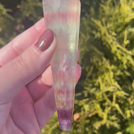This polished fluorite wand showcases beautiful bands of purple, yellow, green, and clear tones, making each piece truly unique. Fluorite is known for enhancing focus, mental clarity, and organization, helping to clear mental fog and promote calm, balanced energy.