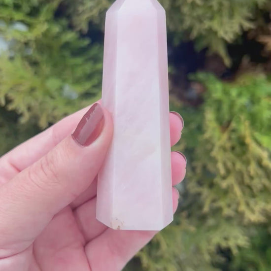 This rose quartz point features soft, blush-pink tones with natural translucency that gives the stone a gentle, glowing appearance. Polished into a classic point shape, it beautifully showcases the delicate color and subtle internal patterns that make each piece unique.