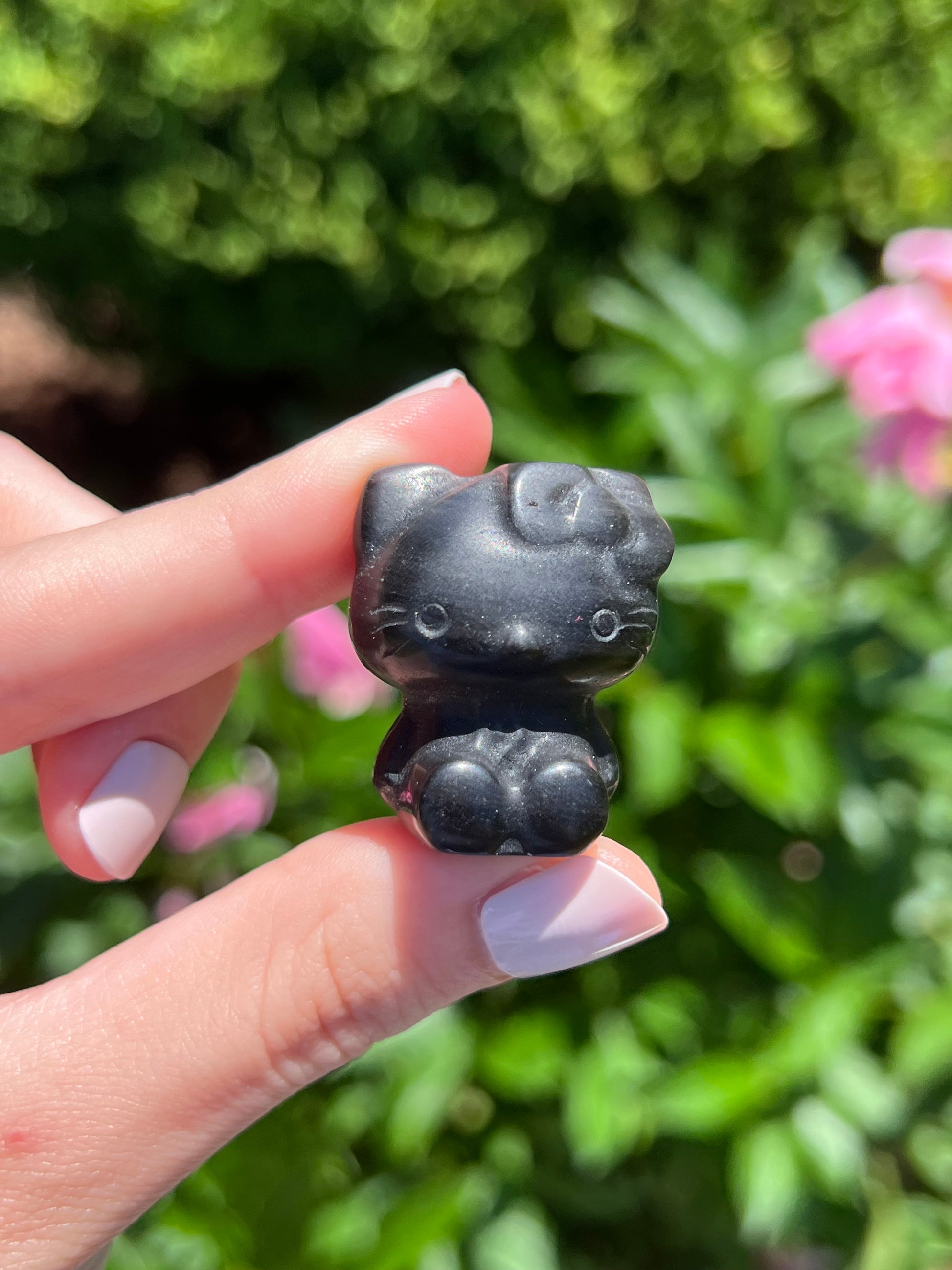 This adorable Hello Kitty carved from Silver Sheen Obsidian is the perfect blend of cute and powerful energy. Silver Sheen Obsidian is known for its shimmering, metallic glow that comes alive under the light—giving your Hello Kitty a magical, almost moonlit shine. It promotes clarity, helping you see situations more truthfully. It encourages self-reflection and inner strength. This Hello Kitty acts as a protective stone, blocking negativity and unwanted energy. It supports grounding and emotional balance.