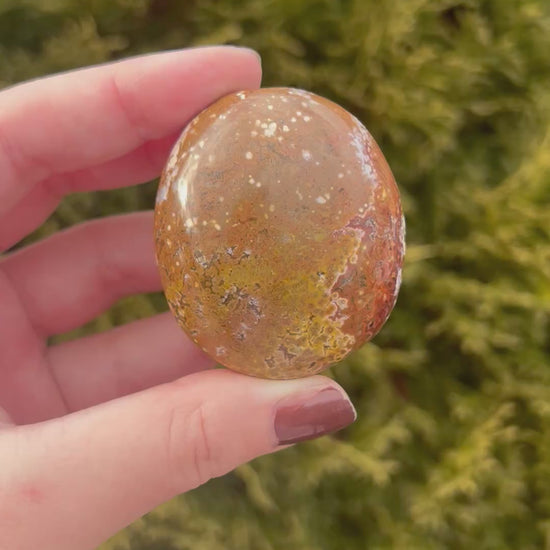 This small Brown Ocean Jasper palm stone features warm earthy browns with natural swirls, speckles, and soft patterns that feel grounding and comforting. Smoothly polished to fit perfectly in the palm, it’s ideal for stress relief, meditation, or carrying with you throughout the day. Ocean Jasper is often associated with emotional balance, patience, and gentle grounding energy, making it a soothing companion during moments of overwhelm. Each palm stone is one of a kind, shaped by nature and rich in calming, ocean-inspired energy.