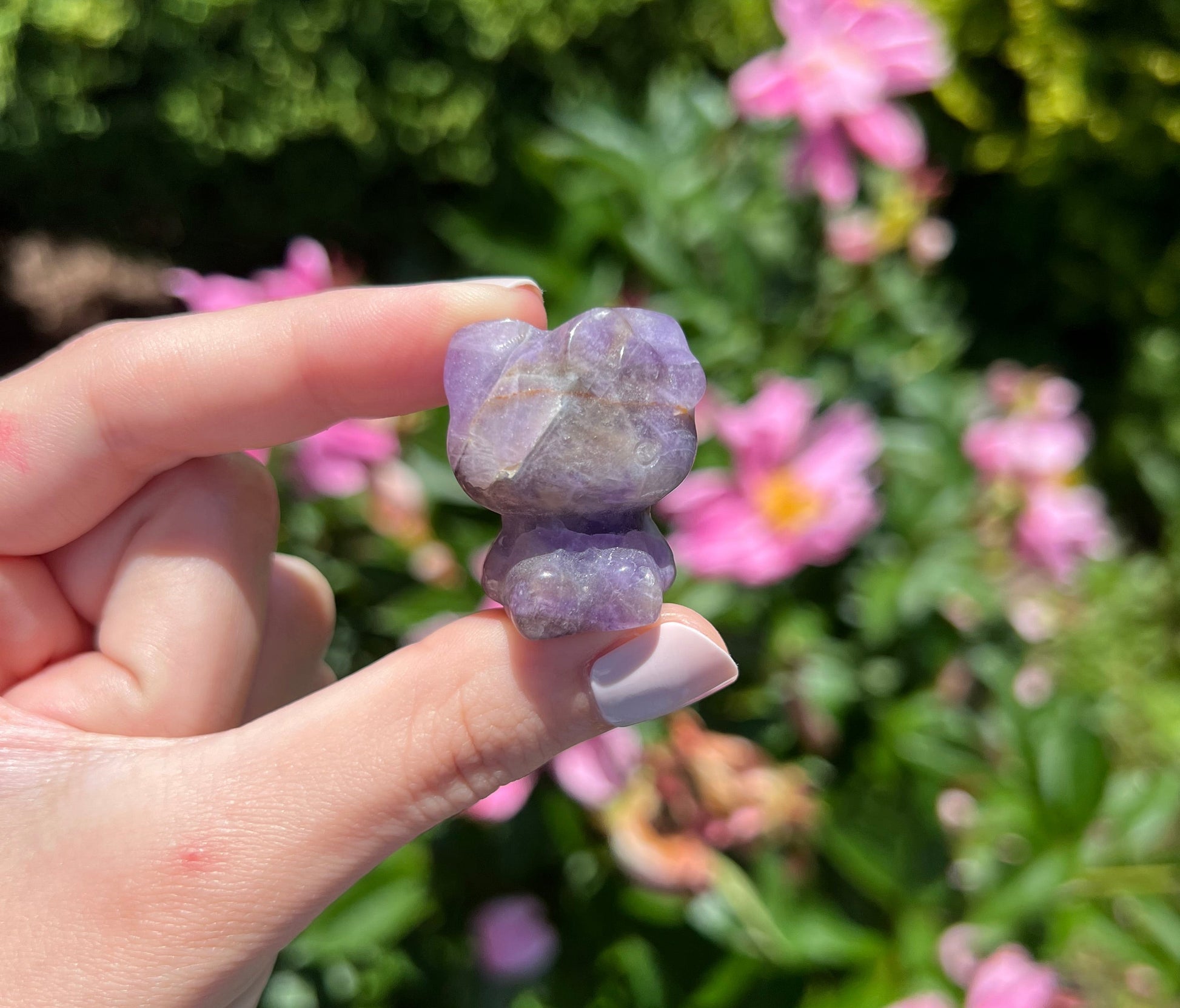 This adorable Hello Kitty carving is made from Dream Amethyst, a soothing blend of soft purples and creamy quartz banding that looks straight out of a dream. Each piece carries a calming, magical energy while adding the perfect touch of cuteness to your collection.