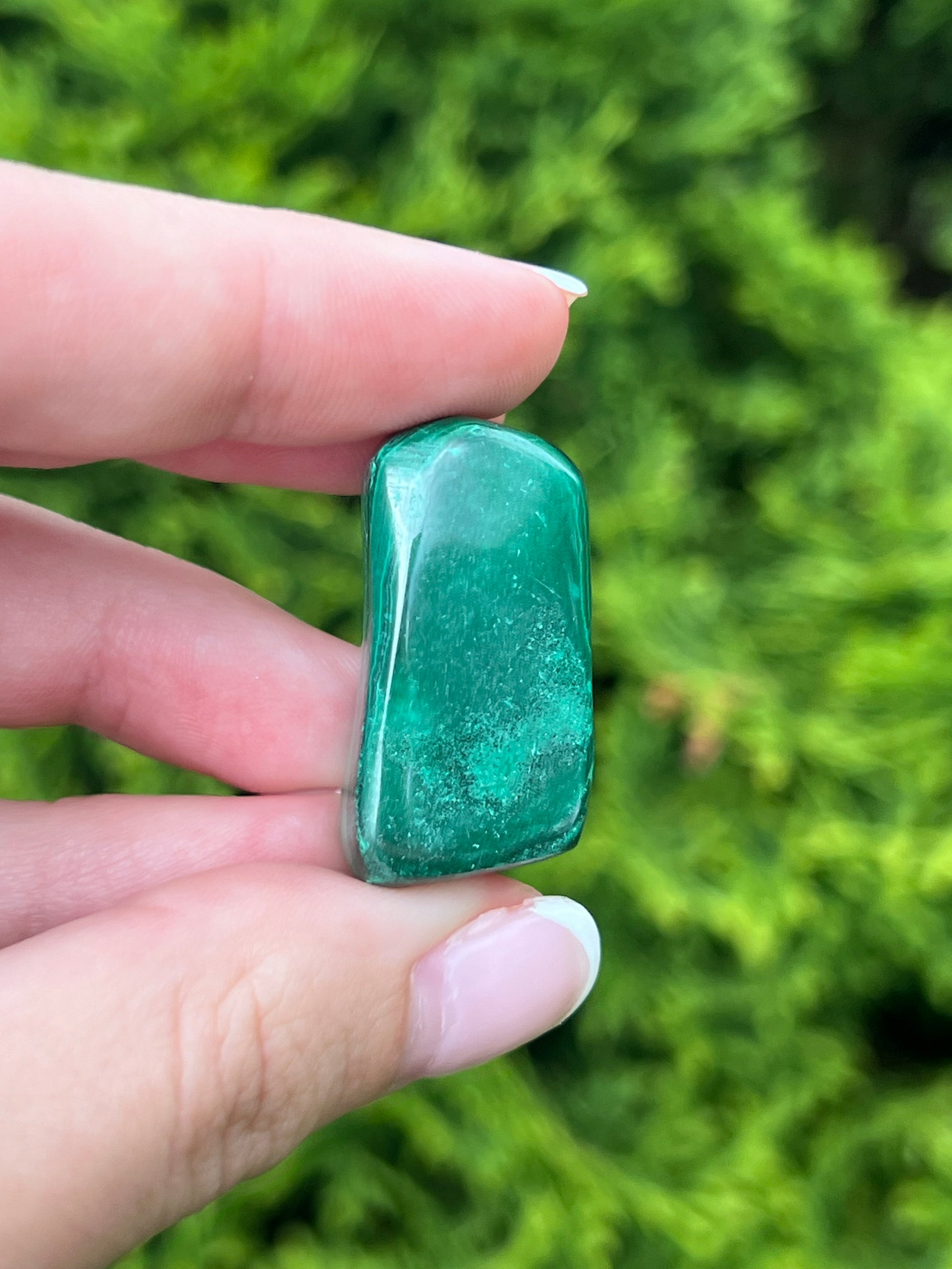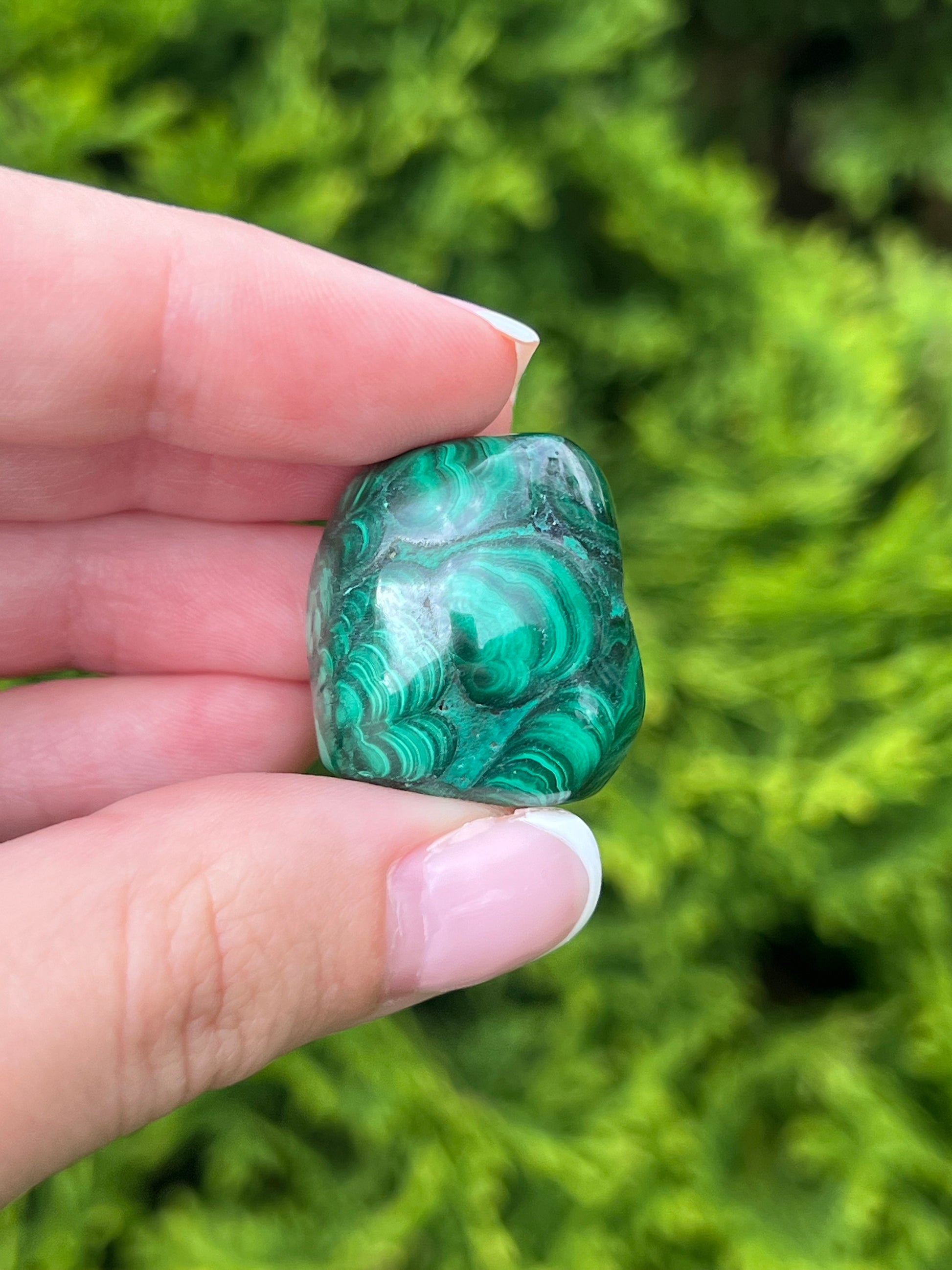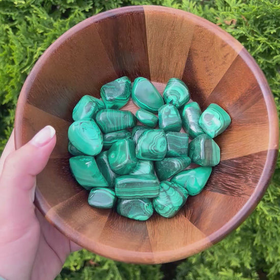 These vibrant tumbled malachite stones feature rich, swirling bands of deep green—each piece uniquely patterned by nature. Known as a powerful stone of protection and transformation, malachite helps absorb negative energy, encourage emotional healing, and support positive change.